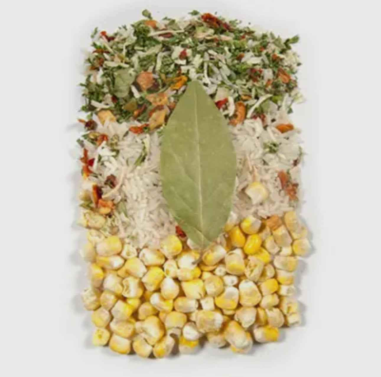 - Ingredients: Sweet Corn, White Rice, Onion, Parsley, Celery, Carrots, Red and Green Bell Peppers, Spinach, Bay Leaf