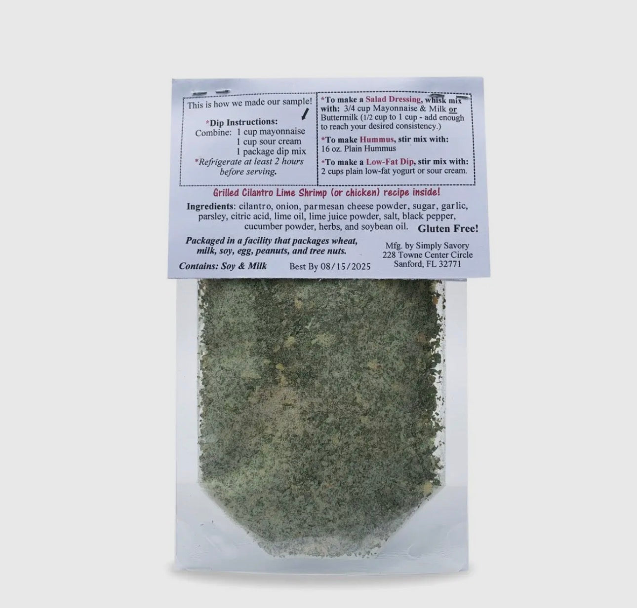 - Ingredients: cilantro, onion, parmesan cheese powder, sugar, garlic, parsley, citric acid, lime oil, lime juice powder, salt, black pepper, cucumber powder, and herbs.