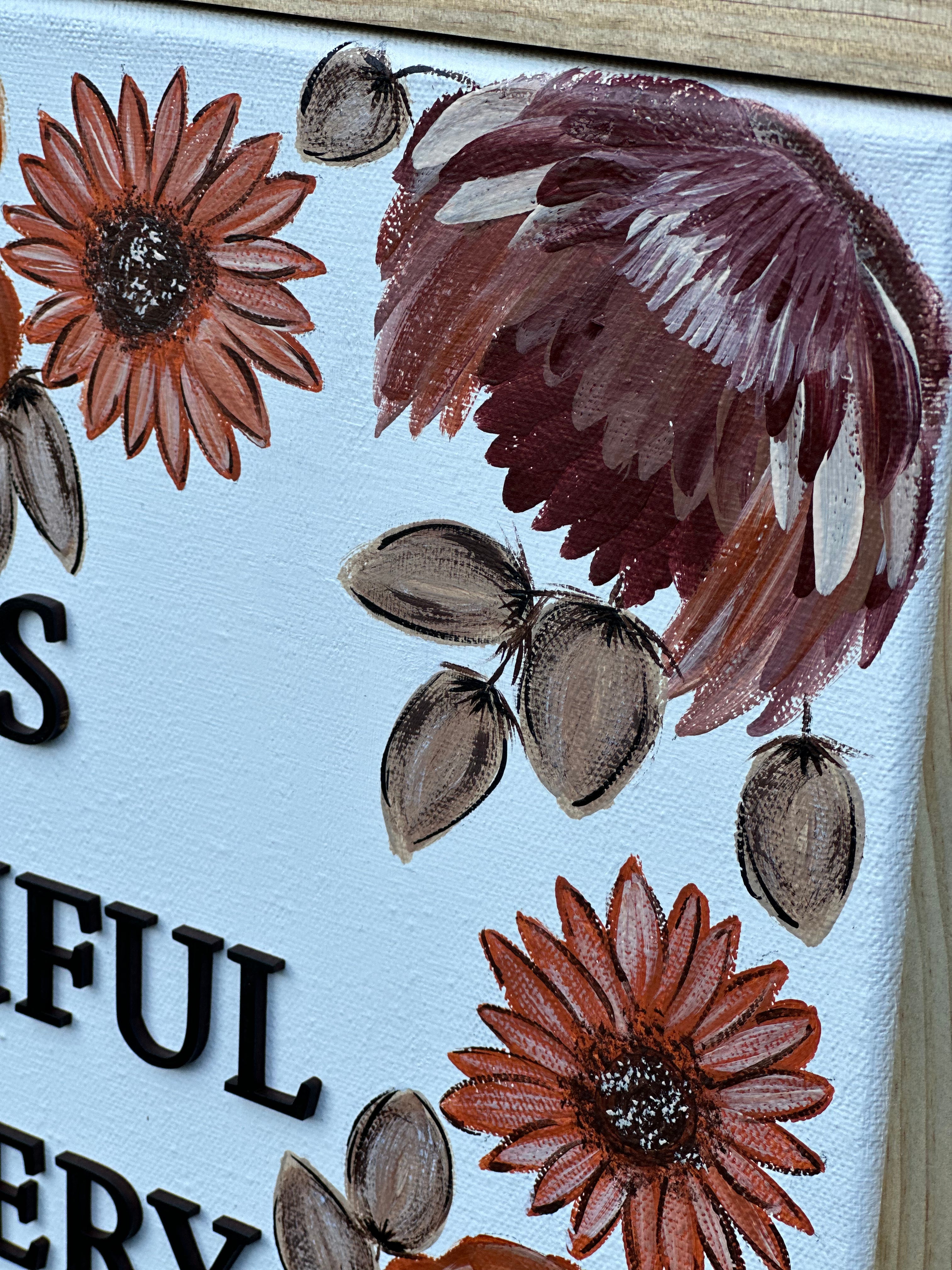This is a new hand painted floral and 3D canvas sign designed exclusively from Root 937. Each sign will be hand painted, none will be exactly alike. Each sign is original and WILL BE MADE TO ORDER. All frames are a special rustic beige blend exclusively from Root 937. The sign is sealed for protection against environmental elements. Makes a great gift!