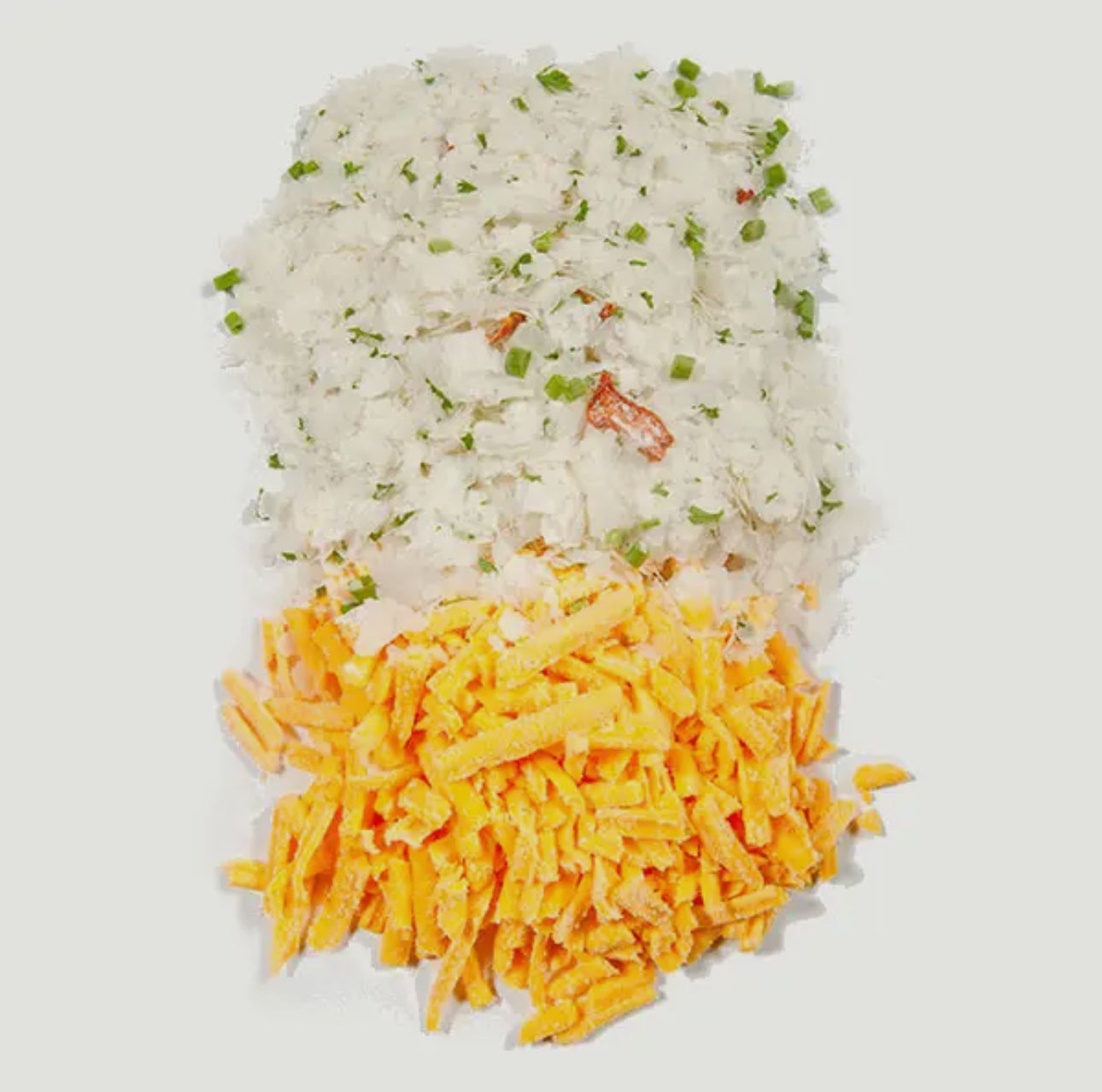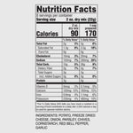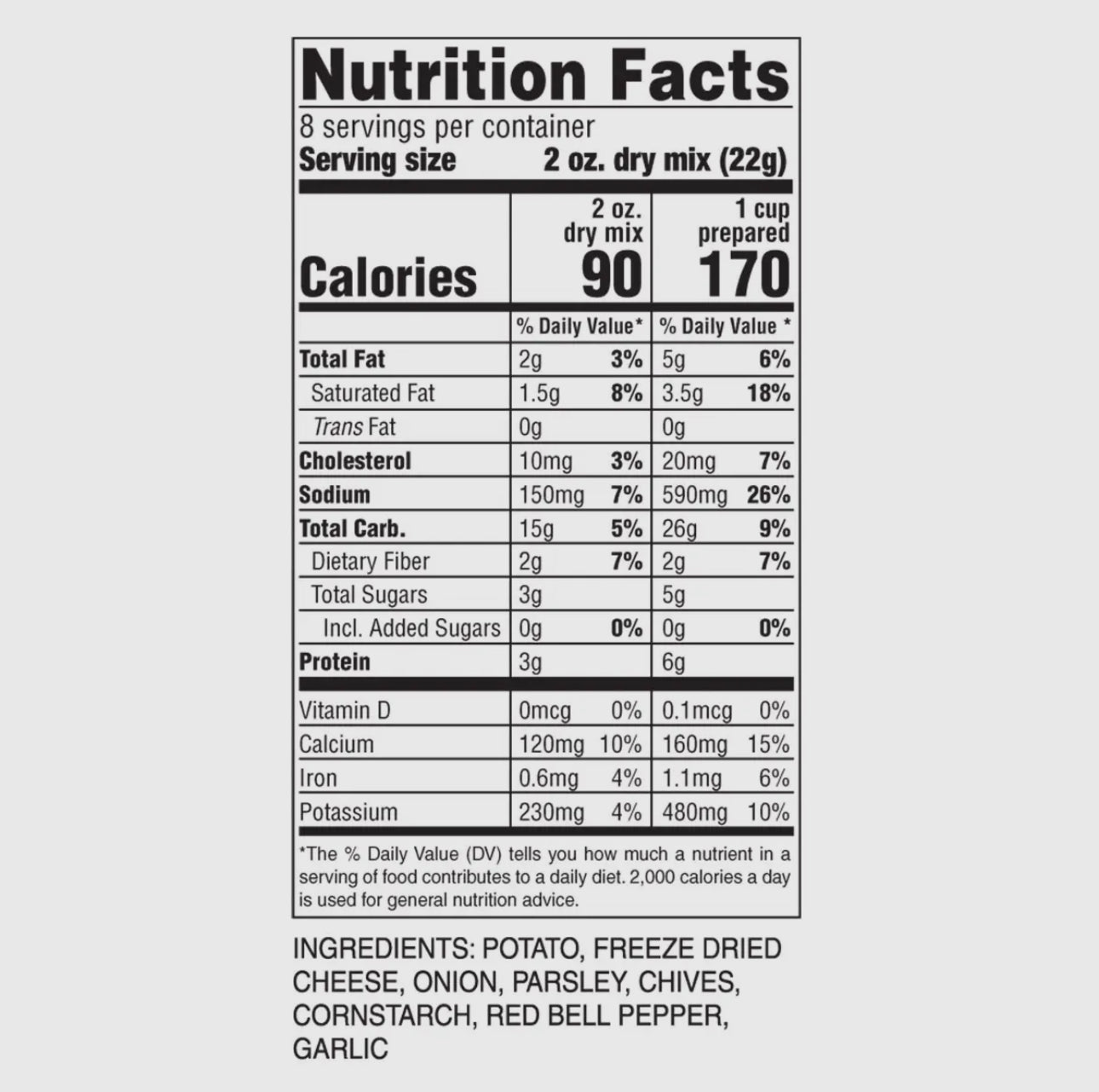 - Ingredients: Potato, freeze-dried cheese, onion, parsley, chives, cornstarch, red bell pepper, grlic