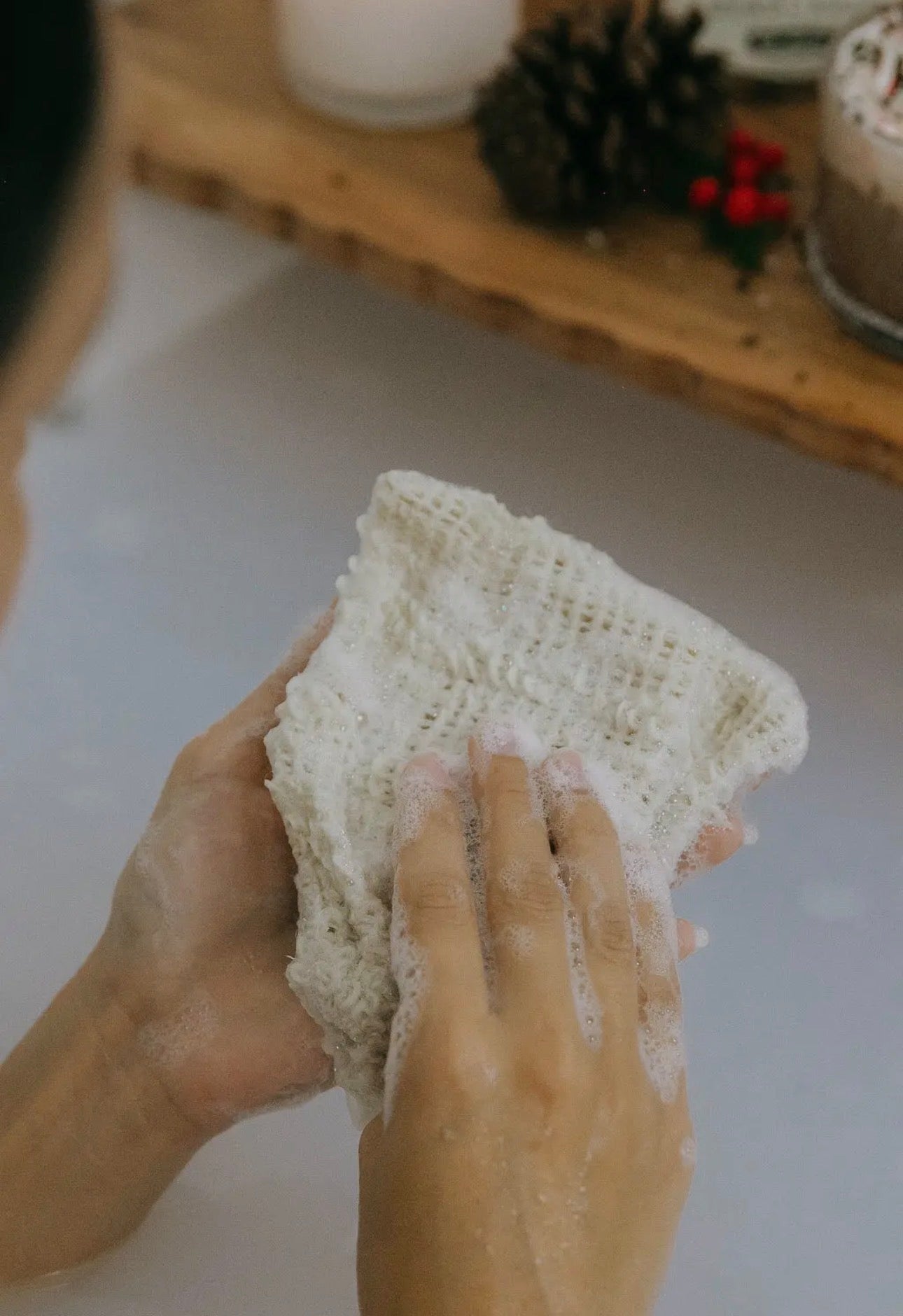 To clean your loofah, simply run it through a wash with a load of laundry and air dry before adding a new bar of soap.