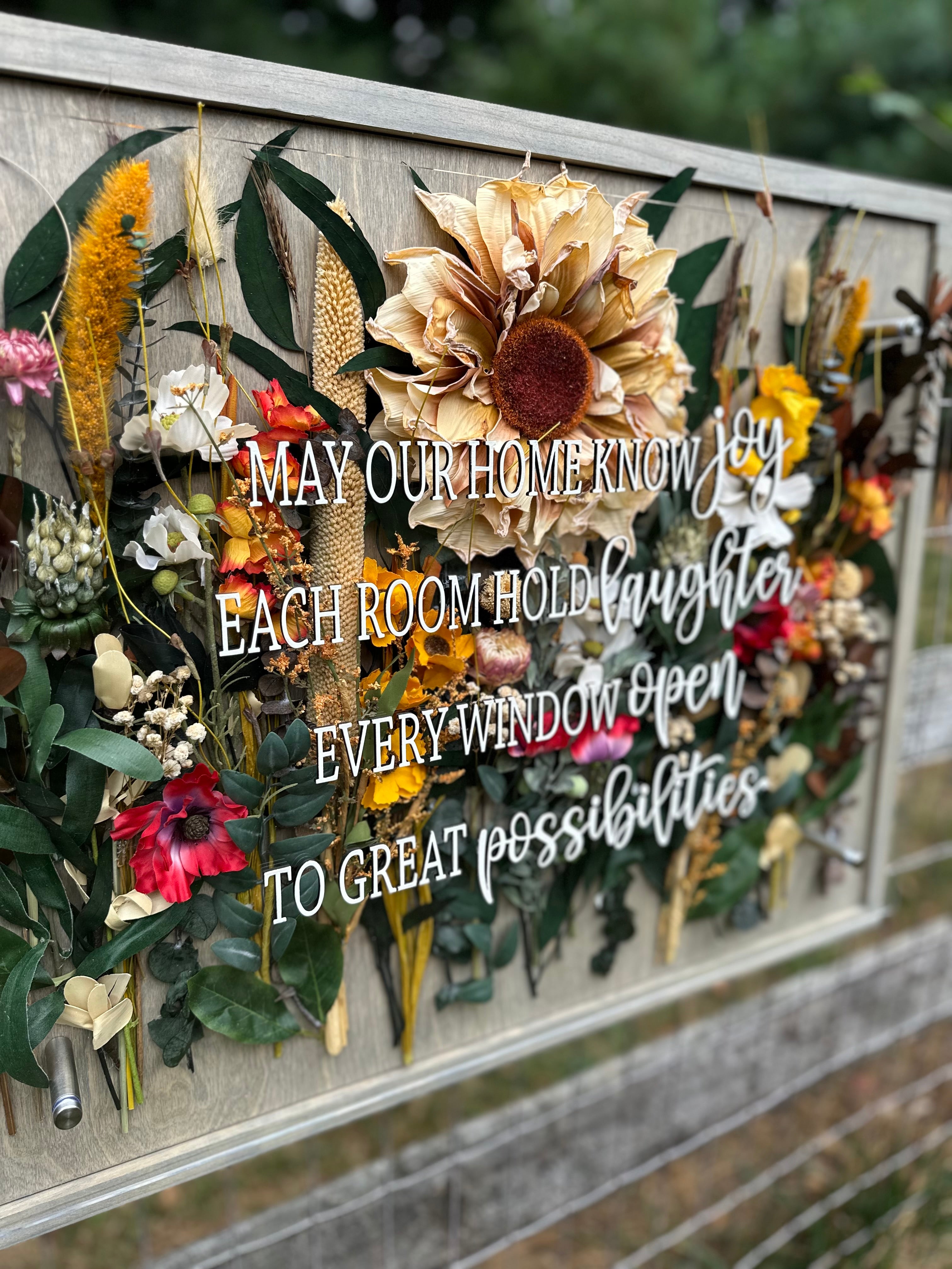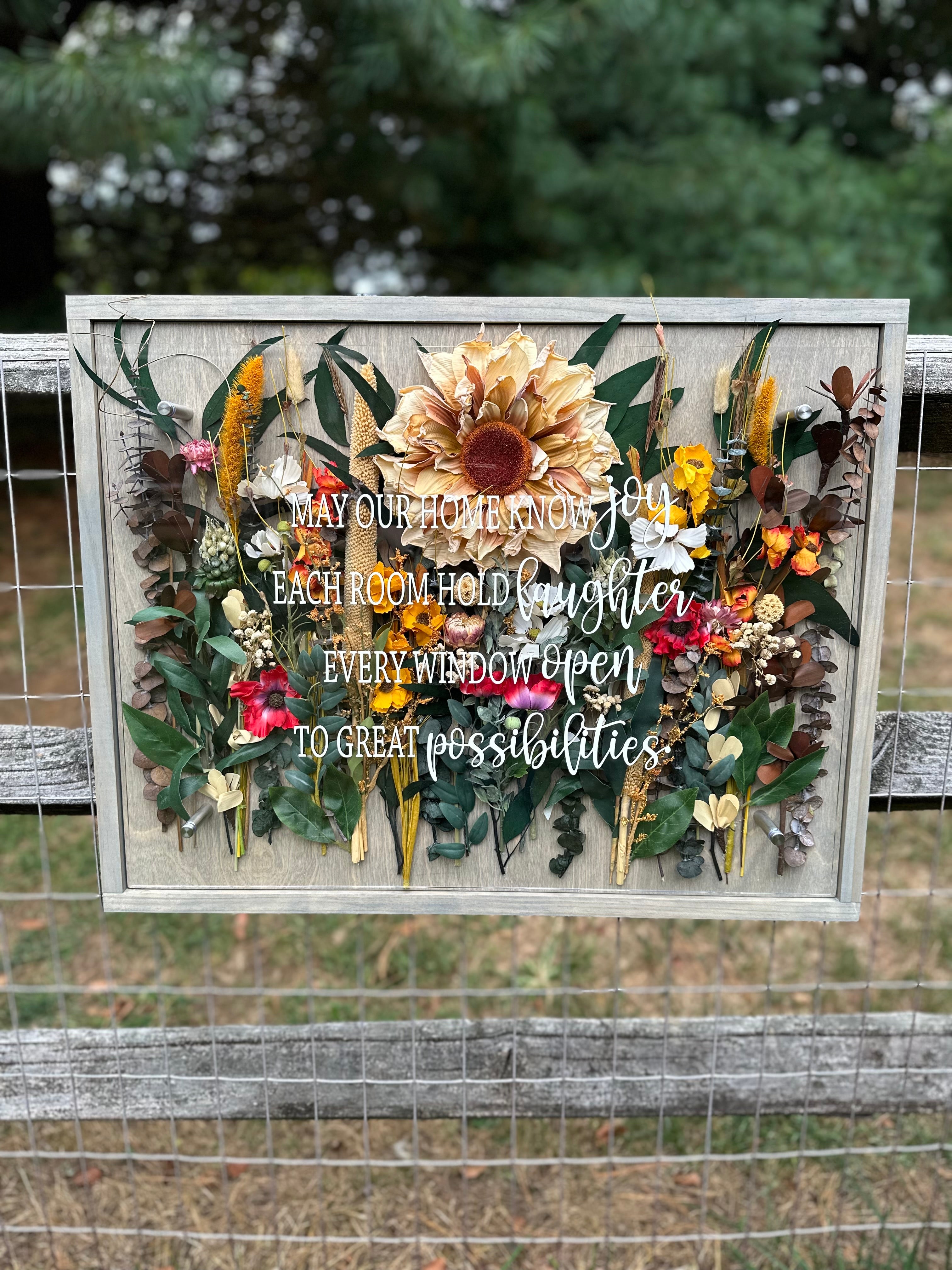 This is a new wood and acrylic 3D floral sign designed exclusively from Root 937. Each sign is hand made. Each sign is original and WILL BE MADE TO ORDER. No two designs will be alike. These signs are designed around the florals used. The flowers will be seasonal, unless we have extra left over from the season. All backing is made from maple wood. All frames are a special rustic beige blend exclusively from Root 937. The sign is made of wood that has natural knots and flaws, which we do not consider defects. If you would like to add your own saying, OR use dried flowers you have from a special occasion, please contact us via email to discuss a custom sign. These make great gifts as forever keepsakes!
