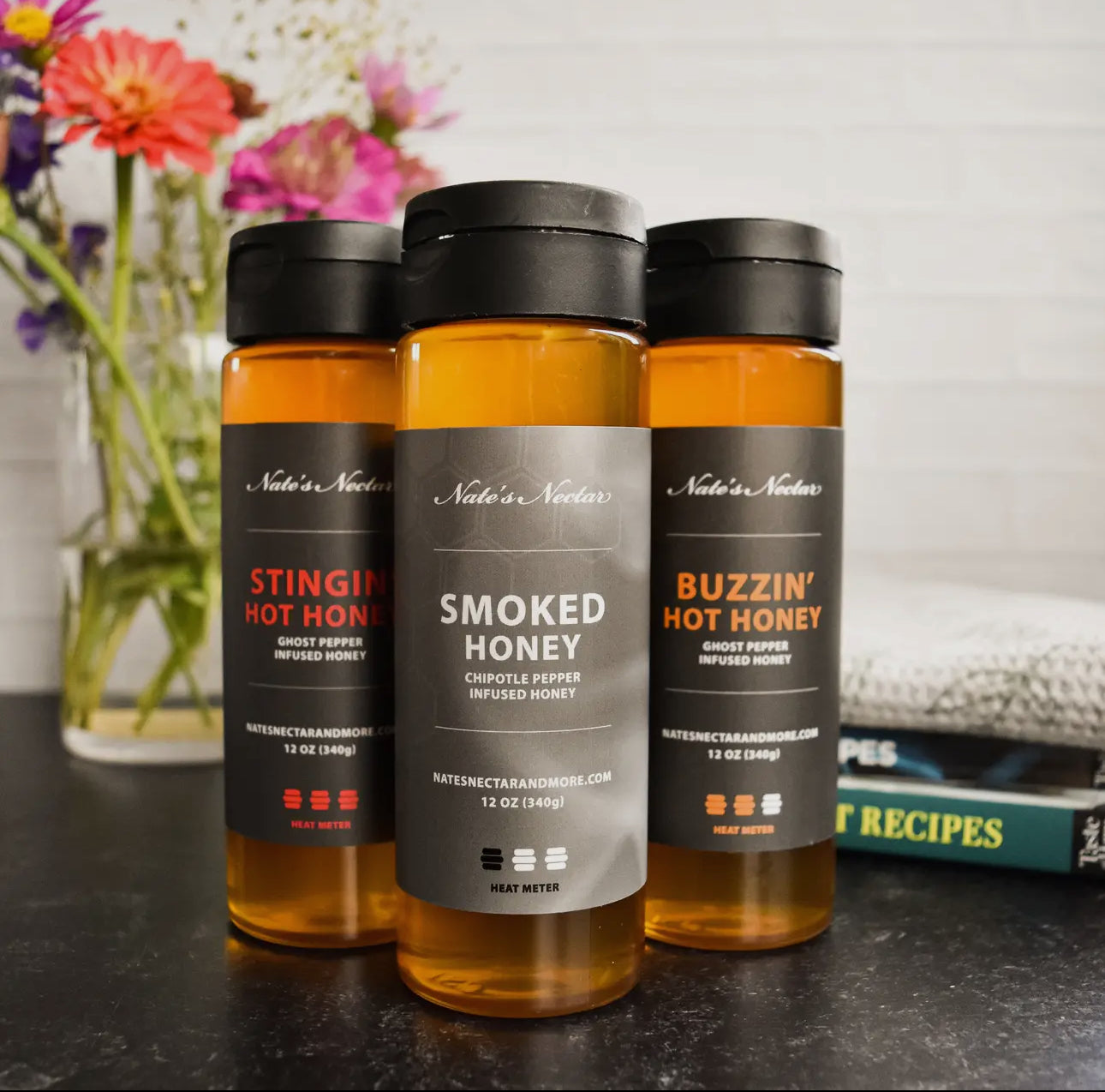 Root 937 now offers Nate's Nectar honey line. Looking for something sweet with a hint of smokey goodness? This natural raw honey has been infused with morita chile peppers to give that sweet smoky flavor that goes great on meats or used as a rug. Enjoy the flavor of smoked honey in your favorite recipes or just as a spread on your favorite bread.